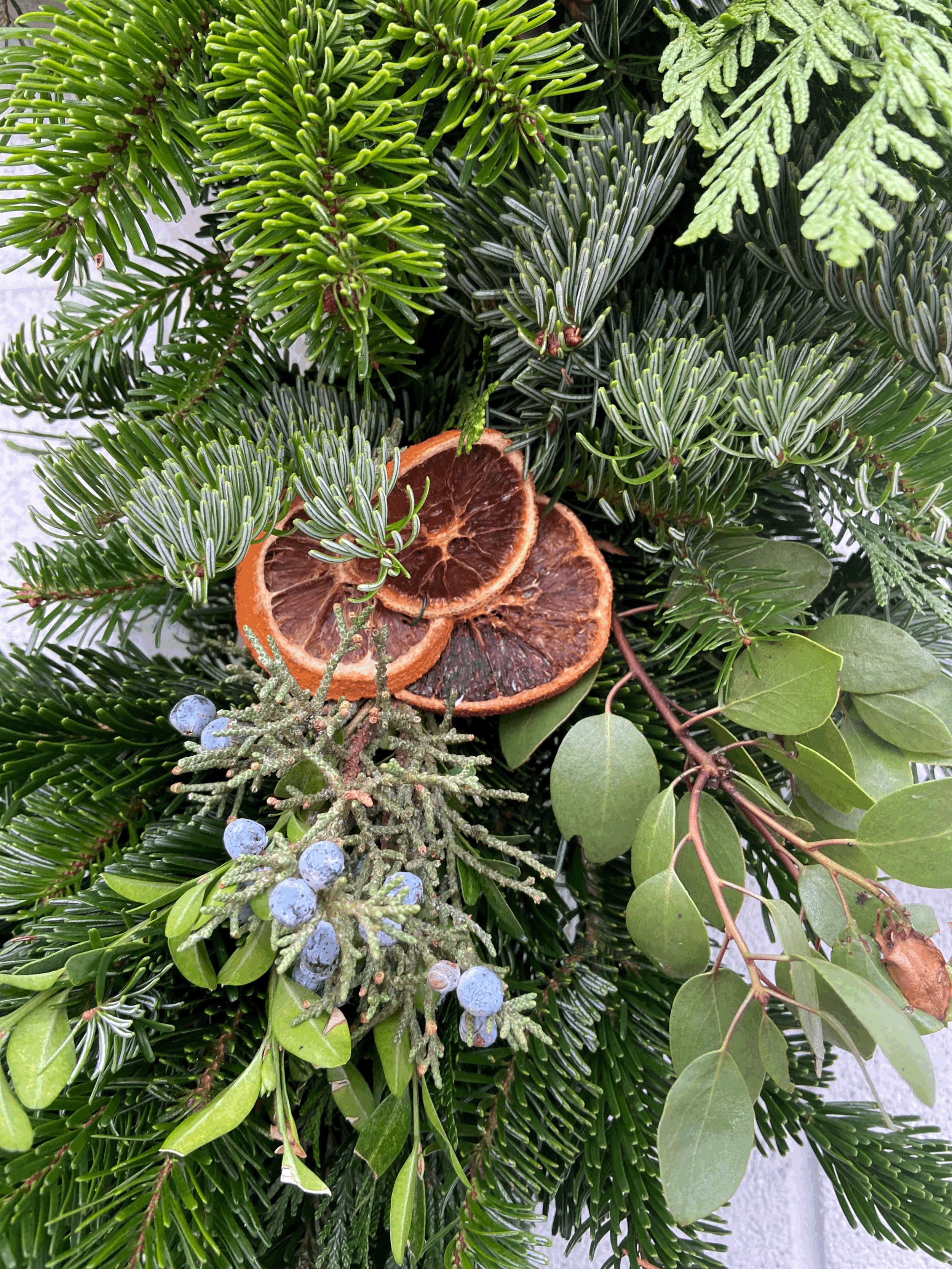 Each of our handmade wreaths is crafted with a beautiful mix of fresh greenery, including Red Cedar, Nordmann Fir, Juniper with berries, and assorted accent foliage. Dried oranges add a festive, natural touch—perfect for welcoming the holiday season.